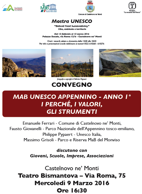 Il più importante tra gli eventi legati alla mostra sull’area Mab Unesco dell’Appennino Tosco Emiliano, “Behind food sustainability” (in corso fino al 13 marzo nelle sale espositive di Palazzo Ducale) è in programma mercoledì prossimo, 9 marzo, a partire dalle 16.30 al Teatro Bismantova. Un convegno, un momento di confronto e di incontro, dal titolo significativo: “Mab Unesco Appennino – Anno 1°: i perchè, i valori, gli strumenti”. Sono previsti interventi istituzionali di alto livello, con la partecipazione di Emanuele Ferrari, vice Sindaco di Castelnovo Monti, Fausto Giovanelli, Presidente del Parco nazionale dell’Appennino tosco emiliano, Philippe Pyapaert, Rappresentante di Unesco Italia, e Massimo Grisoli, del Parco e Riserva Mab del Monviso. Ma accanto a questi ci saranno altre importanti testimonianze, di settori chiave che rappresentano il valore dell’area Mab dell’Appennino: il volontariato, con il Presidente della Croce Verde di Castelnovo Monti e Vetto Iacopo Fiorentini; il turismo, con l’imprenditore Walmer Corbelli titolare della Baita d’Oro in località Sparavalle; la scuola, per la quale interverrà l’insegnante Laura Campari; l’agricoltura, con la testimonianza di Sara Laberenti, dell’azienda agricola Varo di Carpineti, che fa parte del progetto Futuro Verde (che riunisce numerosi giovani imprenditori della montagna).