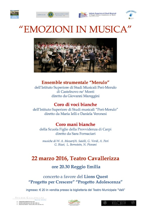Un concerto che vedrà la partecipazione di oltre ottanta musicisti dagli otto ai vent’anni impegnati per sostenere “Progetto adolescenza” e “Progetto per crescere” del Lions Quest di Reggio Emilia. Entrambi i progetti sono promossi dal locale Lions Host e intendono formare docenti altamente qualificati che operano nelle scuole per coinvolgere famiglie, comunità e giovani per apprendere abilità socio-emotive essenziali.