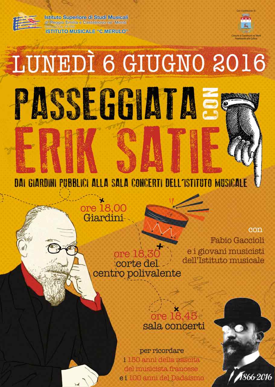 L’Istituto musicale “C. Merulo” offre lunedì 6 giugno a tutta la comunità un particolare evento che vedrà coinvolti quasi tutti i suoi giovani studenti. Accompagnati dalle voci narranti di Fabio Gaccioli ed Emanuele Ferrari i musicisti compiranno una passeggiata tra alcuni luoghi del paese suonando e declamando le musiche e le parole del musicista francese Erik Satie di cui quest’anni si ricordano i centocinquant’anni della nascita.