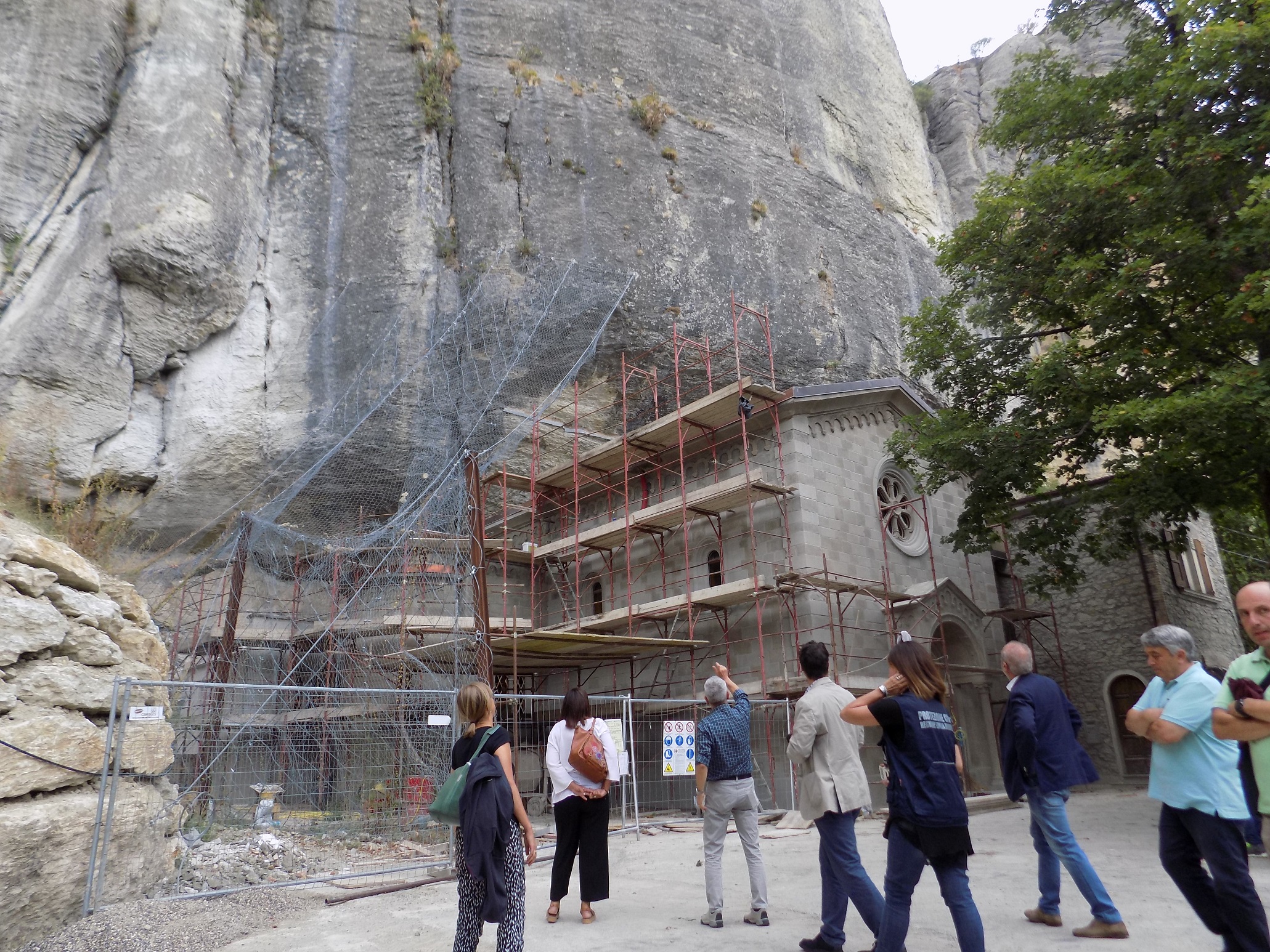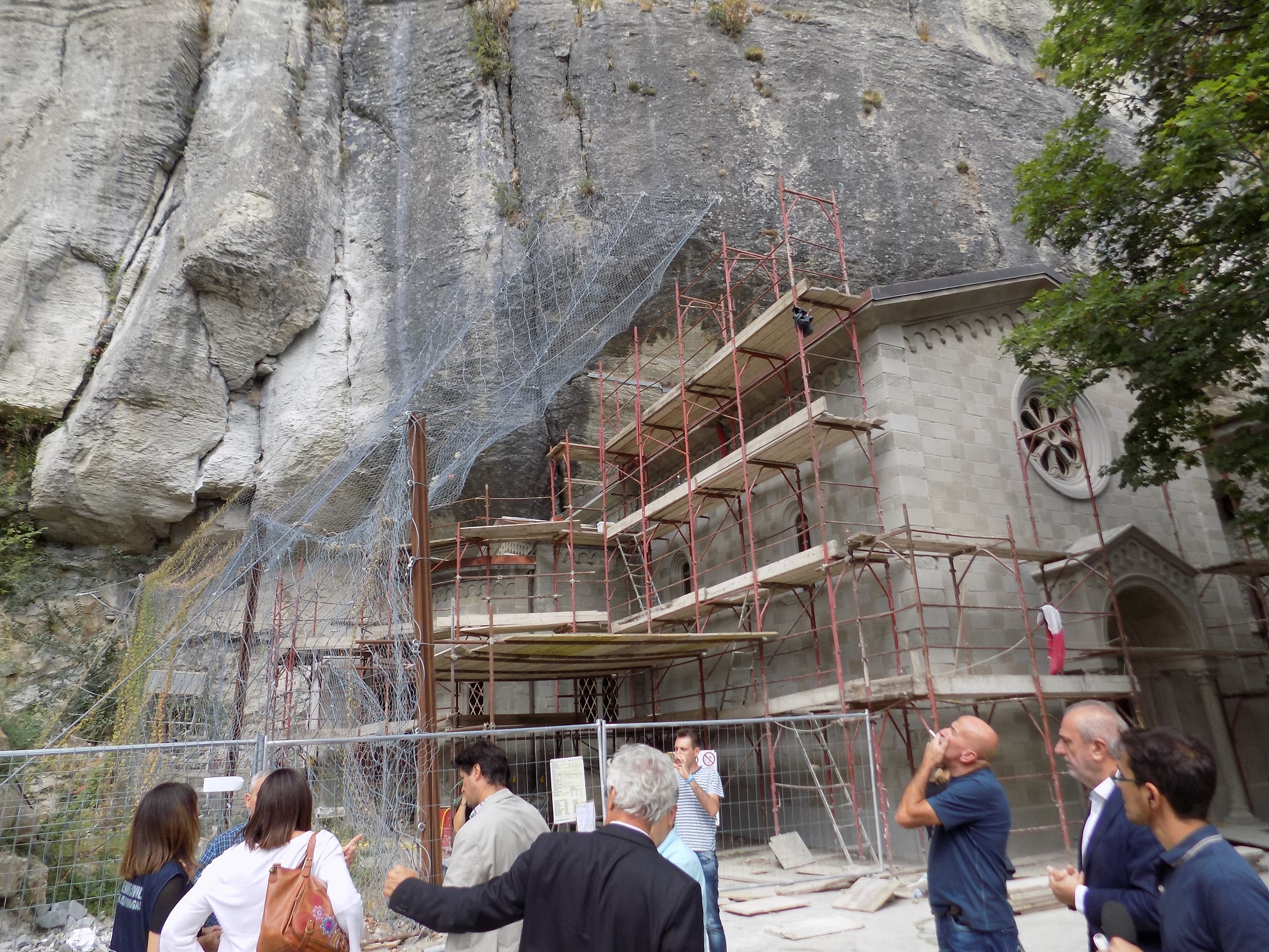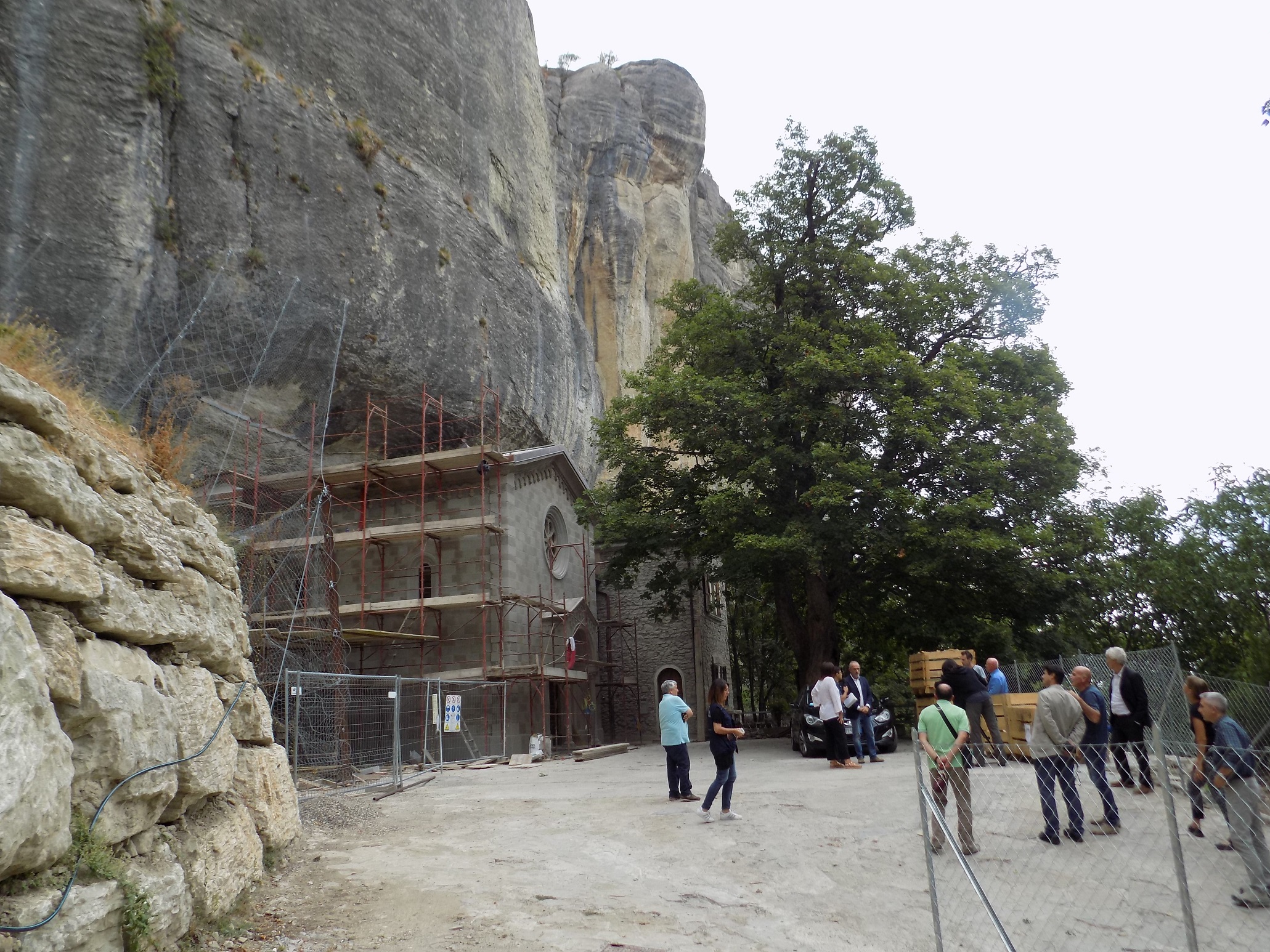 Questi ultimi hanno illustrato due relazioni sugli studi e i seguenti interventi eseguiti in questi anni, a partire da un monitoraggio sulla situazione della Pietra, con rilevatori di distanza nelle spaccature in parete, e webcam che analizzano in tempo reale la situazione delle pareti, da cui si è potuto rilevare il quadro complessivo, con i punti in cui le rocce presentavano possibili rischi. Su queste si è intervenuto con chiodature, poi mascherate in modo che fossero invisibili, oppure con disgaggi e abbattimenti di alcune lame particolarmente instabili. Sono state posizionate anche reti paramassi alla base di alcuni punti, e una “vela” di protezione dell’eremo che sarà poi rimossa una volta conclusi tutti gli interventi nell’area.