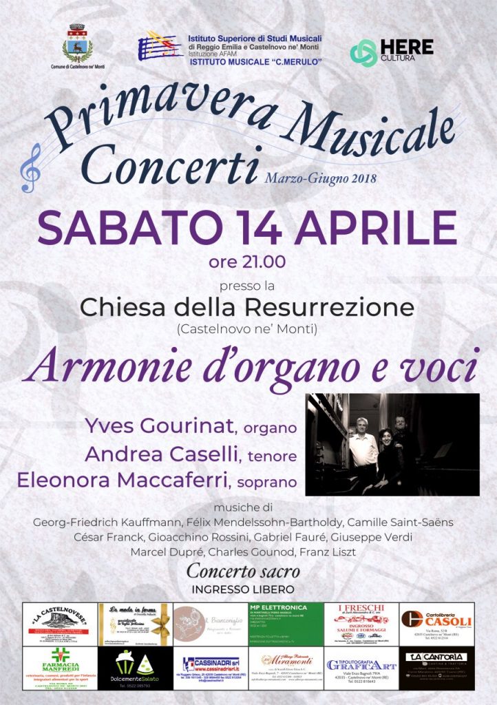 Prosegue all’Istituto Merulo di Castelnovo la rassegna Primavera Musicale, organizzata dallo stesso Istituto, con concerti di alto livello e grande interesse. Prossimo appuntamento sabato, 14 aprile con un concerto d’organo e voci alle ore 21 nella Chiesa della Resurrezione, in via Monzani. Si esibirà suonando l’organo a canne della Resurrezione (realizzato dalla ditta Tamburini di Crema) l’organista francese Yves Gourinat, con la partecipazione dei cantanti reggiani Eleonora Maccaferri (soprano) e Andrea Caselli (tenore). Il programma di sala prevede alcune tra le più belle arie sacre della musica italiana e francese. Un importante appuntamento che permetterà di ascoltare, attraverso una proposta raffinata e di grande qualità, in quanti e quali modi le voci possano dialogare con il suono a volte maestoso, a volte delicato dell’organo.