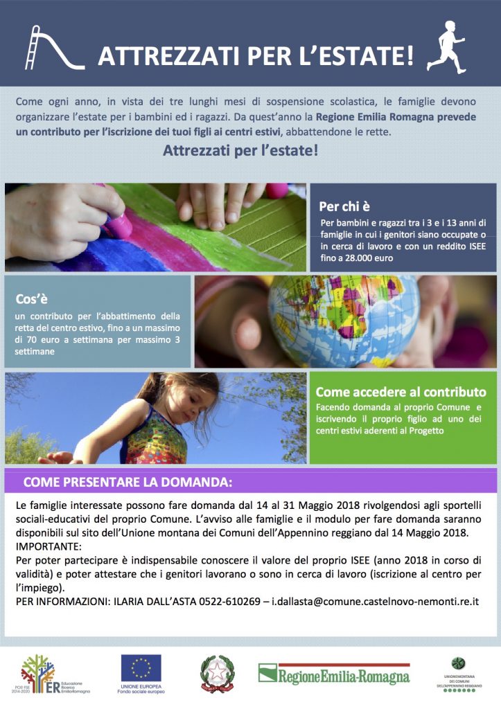 Il contributo è rivolto alla frequentazione dei centri estivi da parte di bambini e ragazzi tra i 3 e i 14 anni, di famiglie in cui i genitori siano occupati o in cerca di lavoro e con un reddito Isee fino a 28.000 euro. Il contributo per l’abbattimento della retta potrà arrivare fino a un massimo di 70 euro a settimana e per un massimo di 3 settimane. Le famiglie interessate possono fare domanda fino al 31 maggio rivolgendosi agli sportelli sociali-educativi del proprio Comune. L’avviso e il modulo per fare domanda sono disponibili sul sito dell’Unione. Per poter partecipare è indispensabile conoscere il valore del proprio Isee (anno 2018 in corso di validità) e poter attestare che i genitori lavorano o sono in cerca di lavoro (iscrizione al centro per l’impiego). Per qualsiasi informazione in merito al progetto e la modulistica si può consultare il sito dell’Unione, www.unioneappennino.re.it, telefonare allo 0522 610269 o scrivere a i.dallasta@comune.castelnovo-nemonti.re.it.