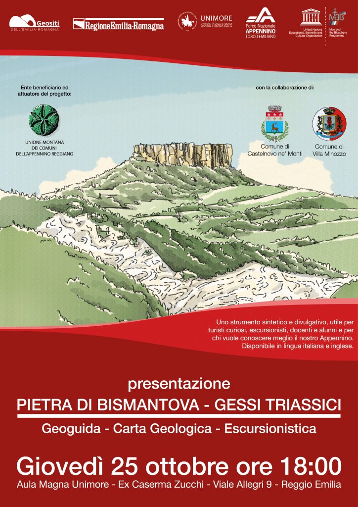 Giovedì 25 ottobre alle ore 18 nell’aula magna dell’Università di Modena e Reggio Emilia, sarà ufficialmente presentata la nuova carta e geoguida della Pietra di Bismantova e della zona dei Gessi Triassici. Un nuovo prodotto cartografico, corredato da immagini e testi, che rappresenta uno strumento divulgativo maneggevole e sintetico pensato per turisti curiosi, escursionisti, docenti, studenti e per tutti coloro che desiderano conoscere meglio alcune delle località più suggestive e naturalisticamente importanti dell’Appennino. Attraverso una carta geologica semplificata, la geoguida conduce i visitatori lungo un percorso didattico che si snoda tra i sentieri del CAI, collegando le più importanti eccellenze ambientali del Parco Nazionale dell’Appennino Tosco-Emiliano e della Riserva MaB Unesco.