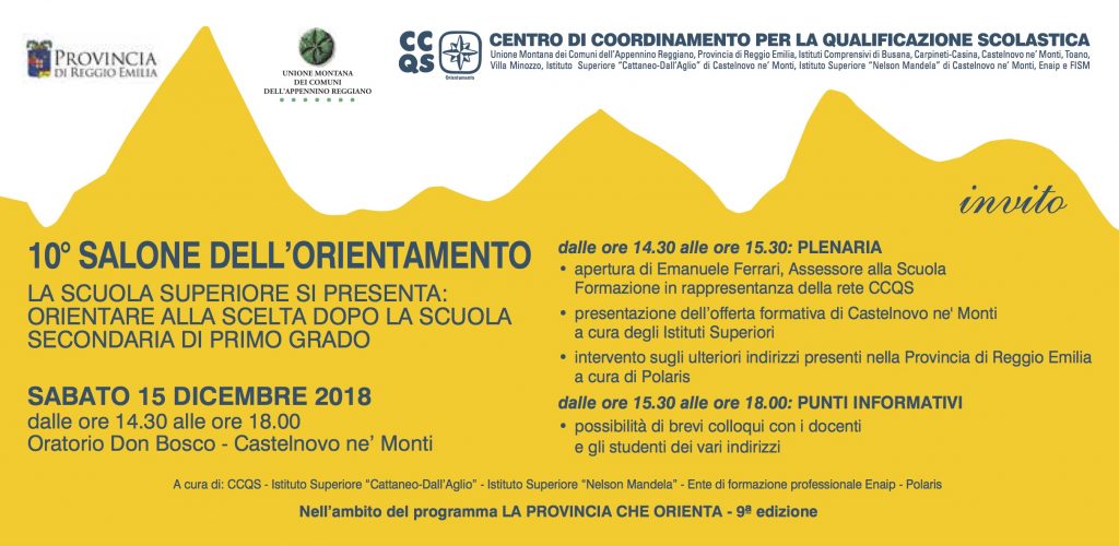 Per informazioni: Istituto superiore Cattaneo – Dall’Aglio tel. 0522 812049; Istituto superiore Mandela tel. 0522 812347, Ufficio Ccqs Castelnovo Monti tel. 0522 610266, 610269.