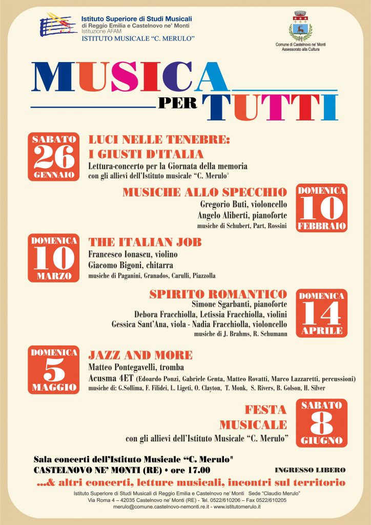 Ad aprire la rassegna saranno sabato 26 gennaio gli studenti dell’Istituto con un concerto dedicato alla musica ebraica e alla narrazione delle storie dei Giusti d’Italia, coloro che durante la Shoah nascosero, protessero e nutrirono per giorni o mesi gli ebrei, mettendo in serio rischio la propria vita. Il concerto rientra tra le attività per la Giornata della Memoria del Comune di Castelnovo Monti. “Luci nelle tenebre: i Giusti d’Italia” è il titolo della lettura-concerto che si terrà nella Sala Concerti del Centro culturale polivalente, sede di tutte le iniziative, sempre alle ore 17.