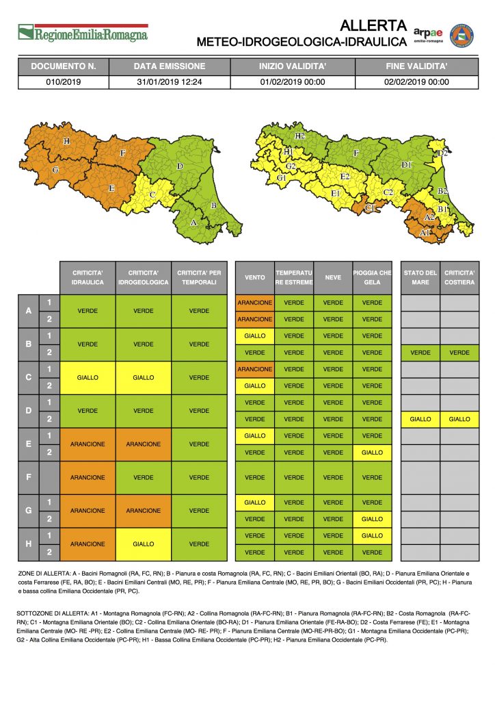 Si segnala che è stata trasmessa per l’intera giornata del 01/02/2019 ALLERTA codice colore ARANCIONE per tutti i comuni dell’Unione Montana (zona E) per criticità idraulica e criticità idrogeologica,