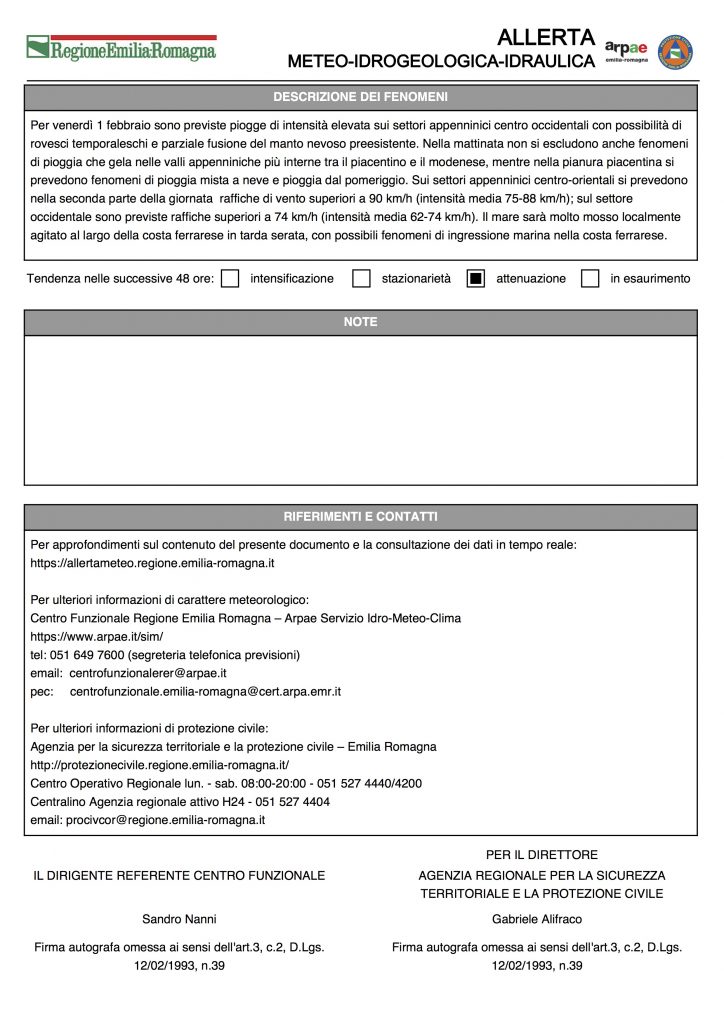 Si consiglia di consultare l’Allerta e gli scenari di riferimento e di seguire l’evolversi degli eventi sul sito: https://allertameteo.regione.emilia-romagna.it
