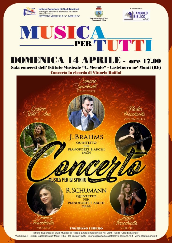 Continua domenica 14 aprile la rassegna “Musica per tutti” dell’istituto “Merulo” di Castelnovo Monti, con un importante concerto che vedrà protagonisti cinque giovani ma già affermati musicisti, che presenteranno due capolavori assoluti della musica romantica europea. Un concerto che sarà dedicato alla memoria di Vittorio Ruffini, recentemente scomparso, grande appassionato di musica e arte che ha sempre sostenuto l’attività e la missione dell’Istituto Merulo di Castelnovo.