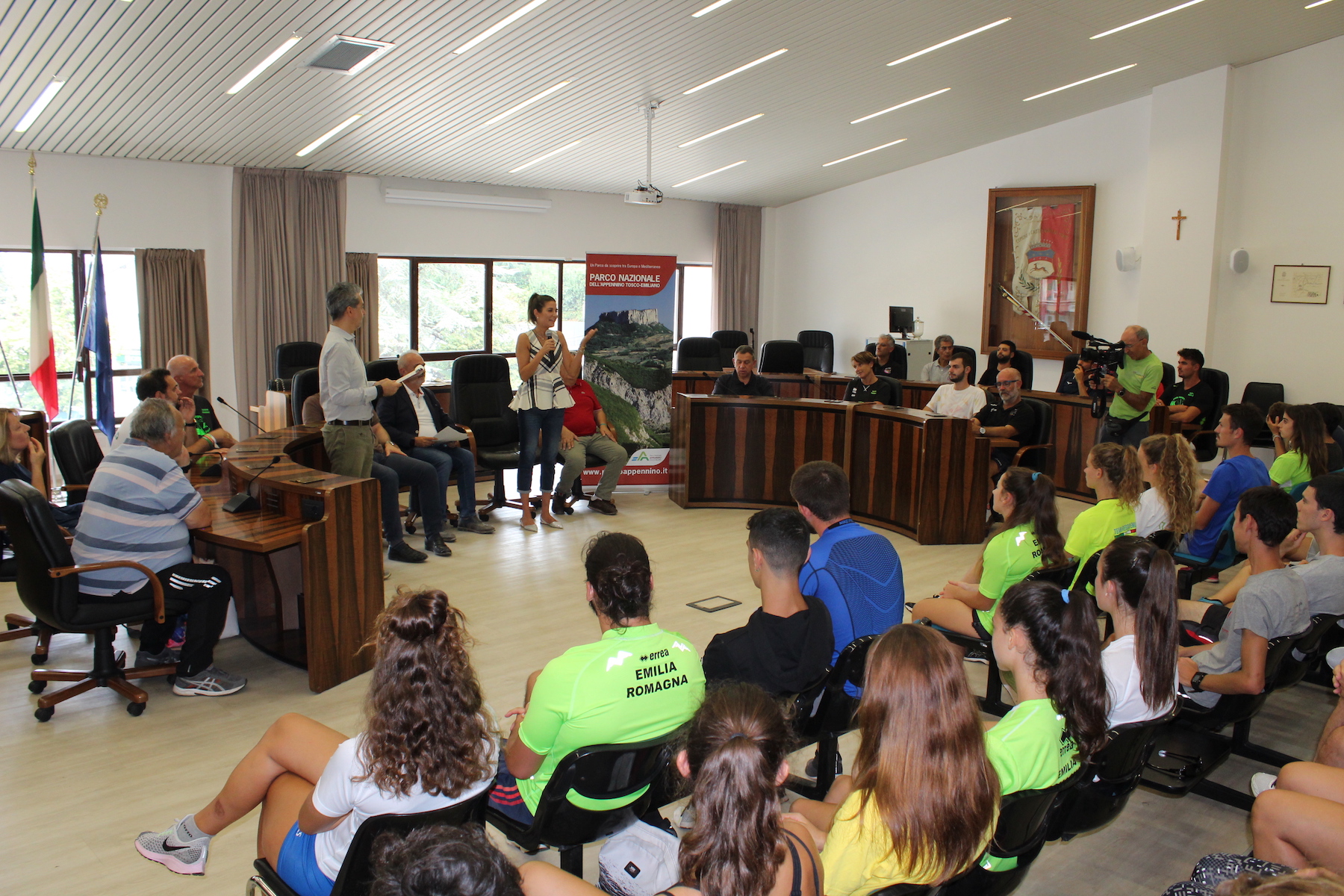 Mercoledì mattina nella sala consigliare del Municipio di Castelnovo il Sindaco Enrico Bini ha accolto una delegazione di atleti, tecnici e dirigenti impegnati nel raduno Fidal Emilia Romagna, in corso di svolgimento nel capoluogo appenninico fino a sabato, 31 agosto. In totale circa 100 giovani atleti e atlete (tra le categorie Allievi, Juniores e Cadetti, dai 15 ai 19 anni) e 40 tecnici Fidal sono a Castelnovo, arrivati da tutte le province dell’Emilia Romagna, “per riprendere gli allenamenti in compagnia – come ha spiegato Stefano Ruggeri, Fiduciario tecnico Fidal Emilia Romagna – dopo un programma estivo eseguito spesso in solitaria o a ranghi ristretti, e la chance di perfezionare alcuni aspetti tecnici in vista del ritorno alle gare nel mese di settembre. Questo appuntamento a Castelnovo è divenuto per noi una piacevole tradizione, che si ripete da tanti anni: troviamo sempre un’ospitalità straordinaria grazie alle strutture sportive del paese, alla disponibilità degli albergatori e alla collaborazione delle società sportive locali che si rivela di grandissima importanza. Ci sentiamo davvero come accolti in famiglia”. Oltre al Sindaco Bini, la delegazione Fidal è stata accolta dal Consigliere con delega alle politiche giovanili Claudia Martinelli, gli Assessori ai Lavori pubblici Giorgio Severi e al Bilancio Daniele Valentini, Maria Azzolini e Nino Teggi dell’Atletica Castelnovo Monti, Iacopo Fiorentini in rappresentanza della Polisportiva Quadrifoglio. “È il diciottesimo anno che Fidal Emilia Romagna sceglie Castelnovo per il proprio raduno estivo – spiega Bini –. Alcuni dei ragazzi che oggi sono qui nascevano proprio nell’anno del primo raduno castelnovese. Siamo felicissimi e lusingati per la longevità di questa collaborazione, che è la più bella testimonianza della qualità dei nostri impianti e della nostra ospitalità. Il progetto Castelnovo paese per lo Sport in questi anni ha continuato a crescere ed è sempre più strategico, non solo per divulgare le buone pratiche dell’attività fisica per il benessere e il corretto sviluppo psicofisico dei ragazzi, ma anche come veicolo di promozione del territorio e per le ricadute ricettive ed economiche. L’Atletica Leggera è diventata a sua volta una disciplina simbolo per il nostro paese, per cui non posso che ringraziare la società Atletica Castelnovo Monti e la Polisportiva Quadrifoglio, e con loro gli albergatori locali, per l’impegno comune rivolto a offrire il miglior biglietto da visita del territorio. Quest’anno possiamo davvero essere tutti soddisfatti, perché è stata un’estate straordinaria: abbiamo avuto i raduni pre-campionato di A.C. Reggiana e Pallacanestro Reggiana, i Basket camp per i ragazzi, tante manifestazioni che hanno richiamato centinaia di partecipanti come il Giro della Pietra, la Color Vibe e la Appenninica Mtb dedicata alle mountain bike. Ora la stagione sportiva prosegue ancora, con il raduno Fidal che porterà circa 450 pernottamenti, poi seguiranno il raduno di pallavolo con Giovolley Reggio e Reggiana Pallavolo Femminile i primi di settembre, il raduno di pallavolo con tre squadre della società di Bellaria Igea Marina la settimana successiva, con gli amici romagnoli che ritornano dopo la bella esperienza nel torneo giovanile di Pasqua. Un’attrattività che fa leva sulla nostra dotazione impiantistica, dal Centro Coni al centro polifunzionale Onda della Pietra, le palestre di Castelnovo e Felina, e l’ambiente appenninico per le attività outdoor. Sugli impianti abbiamo investimenti importanti in partenza nei prossimi mesi, come ad esempio al Centro Coni per il rifacimento della pista di atletica e dell’impianto di illuminazione, con nuove lampade a Led che permetterà una forte riduzione dei costi in caso di eventi serali. Investimenti importanti ma che, grazie anche ai finanziamenti ricevuti, compiamo con grande convinzione perché negli anni abbiamo visto che hanno una ricaduta concreta di assoluto rilievo”.