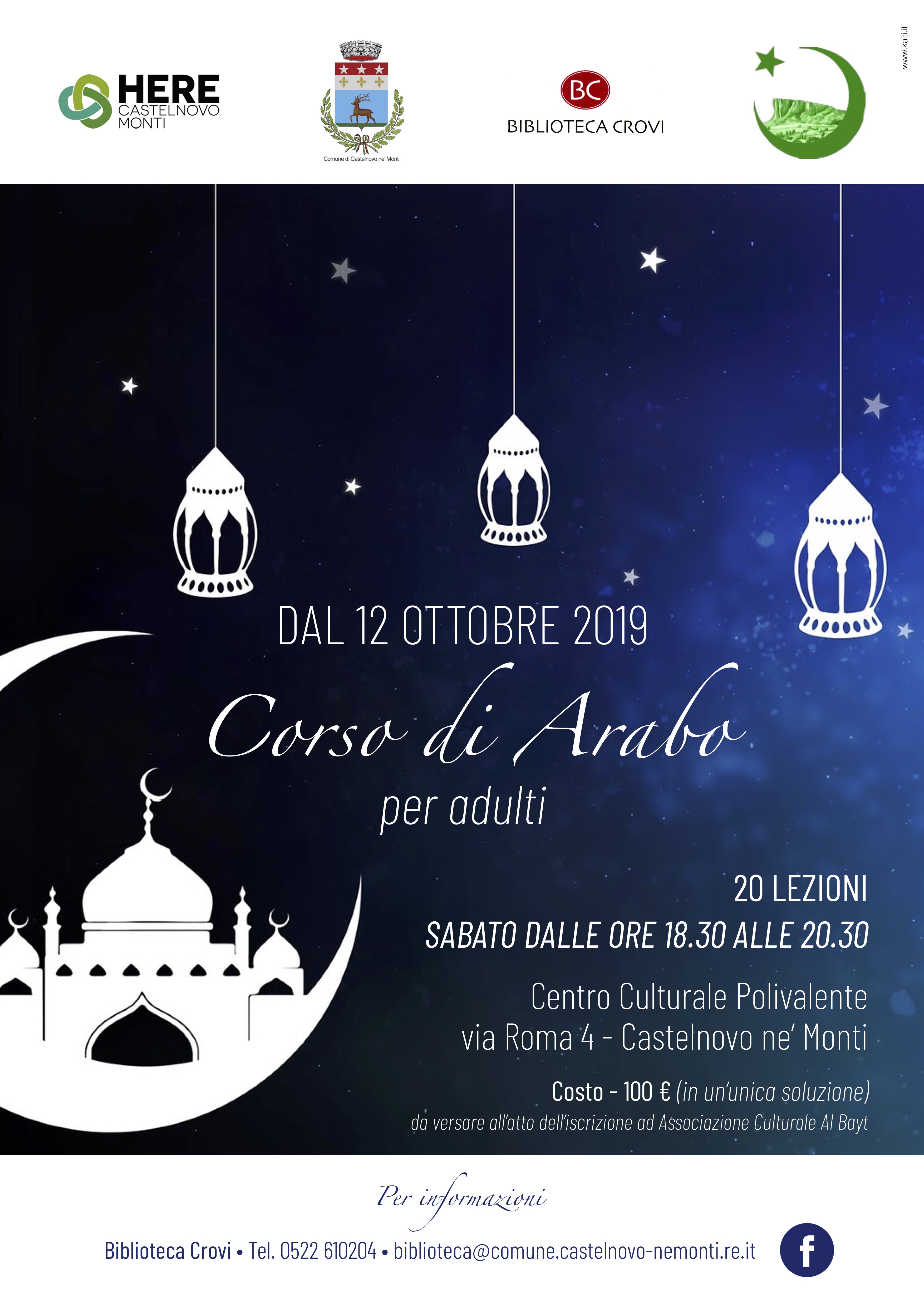 Si tratta di un corso di arabo per adulti, che prenderà il via il 12 ottobre 2019: si svilupperà in 20 lezioni, che si terranno ogni sabato, dalle 18.30 alle 20.30, al Centro culturale Polivalente (costo: 100 euro). Per informazioni è possibile contattare la biblioteca: tel. 0522 610204, biblioteca@comune.
