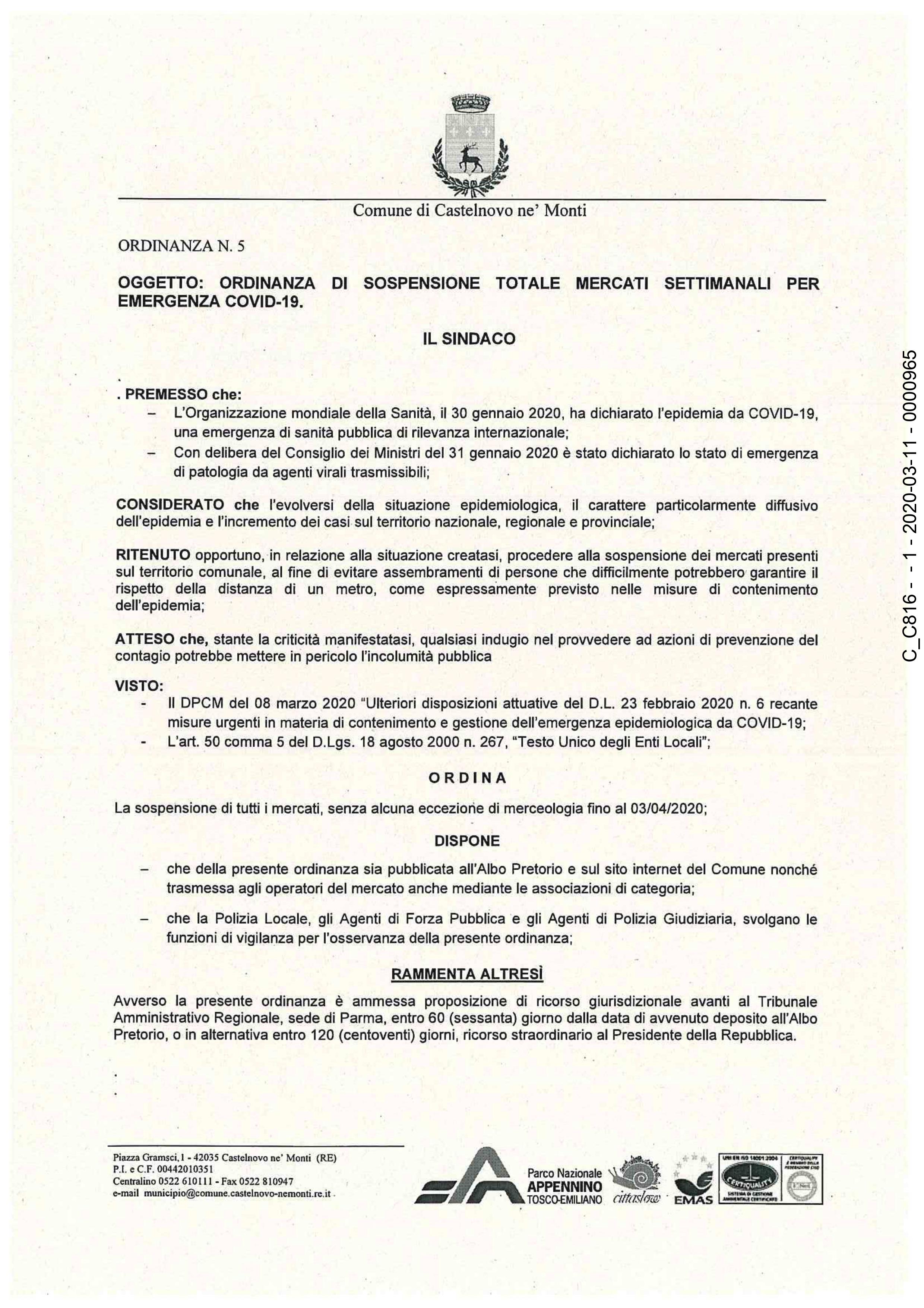 ORDINANZA – Sospensione attività mercati settimanali