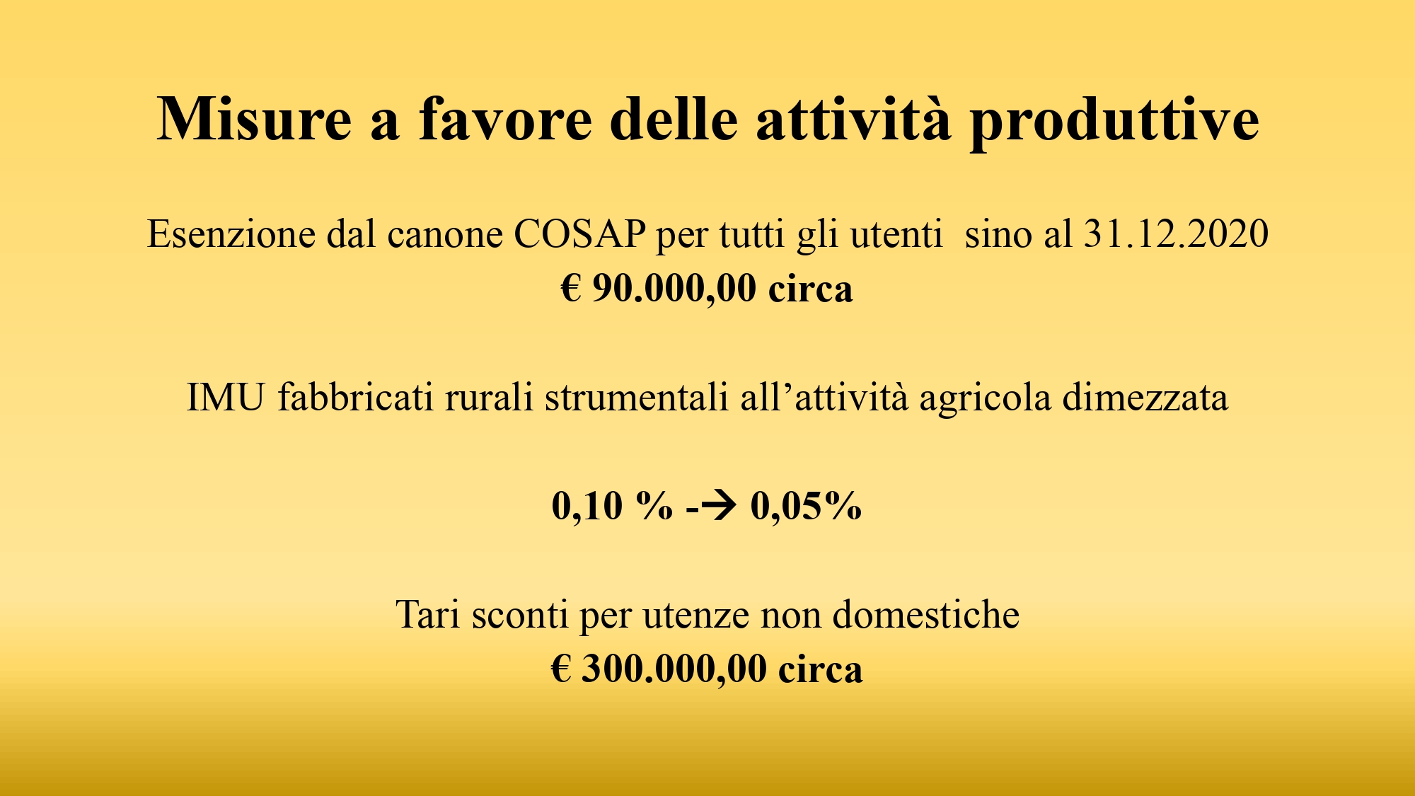 Le azioni principali messe in campo sono tre: la prima riguarda l’azzeramento della Cosap per tutto l’anno. I pubblici esercizi e anche i banchi del mercato fino alla fine dell’anno non pagheranno l’occupazione del suolo pubblico. Si tratta di una misura da circa 90.000 euro, che riteniamo importante sia nell’ottica di una maggiore sicurezza per i frequentatori dei locali che avranno a disposizione le distese estive all’aperto, sia nell’ottica della valorizzazione turistica del paese. La seconda misura è la riduzione dell’Imu agricola sui capannoni e i beni immobili strumentali alle attività: passiamo da un’imposta dello 0,10 annuo allo 0,05 del 2020, quindi l’abbiamo dimezzata. La terza, davvero molto rilevante, è legata agli sconti sulla Tari per circa 300.000 euro, che vanno a incidere sulle attività commerciali e utenze produttive. Nel totale si tratta di interventi per oltre 400.000 euro che andranno a sostenere la quasi totalità delle realtà produttive del territorio, in tutto quasi 800 saranno beneficiate da questi provvedimenti.