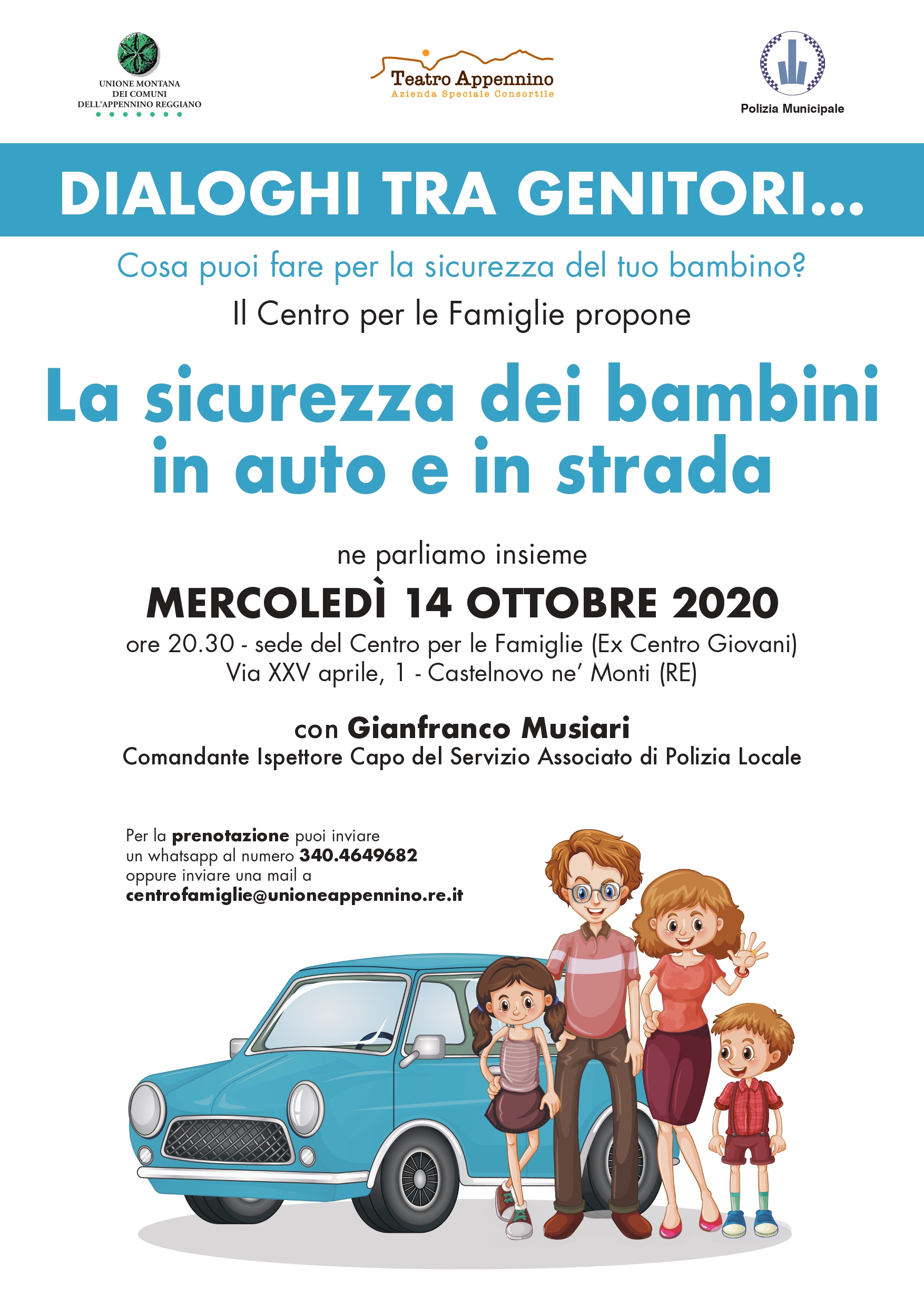 “Dialoghi tra genitori: cosa puoi fare per la sicurezza del tuo bambino? La sicurezza dei bambini in auto e in strada” è il tema che sarà affrontato durante la serata, alla quale interverrà per confrontarsi con i presenti Gianfranco Musiari, Comandante Ispettore Capo del Servizio Associato di Polizia Locale dell’Unione. Per la prenotazione è possibile inviare un messaggio whatsapp al numero 340 4649682 oppure una mail a centrofamiglie@unioneappennino.re.it.