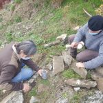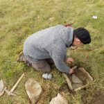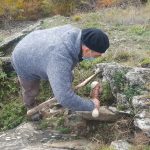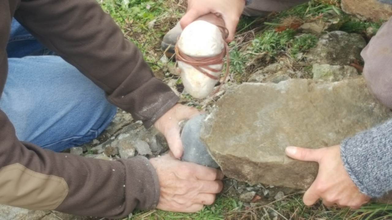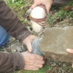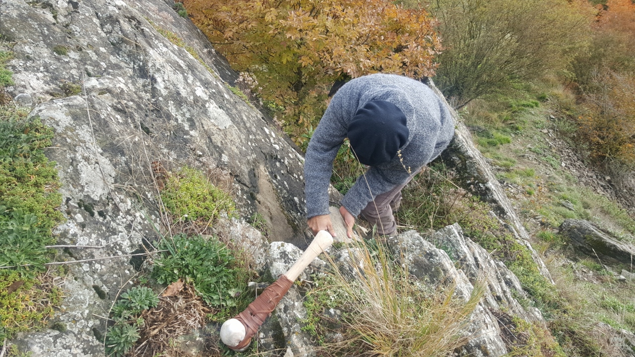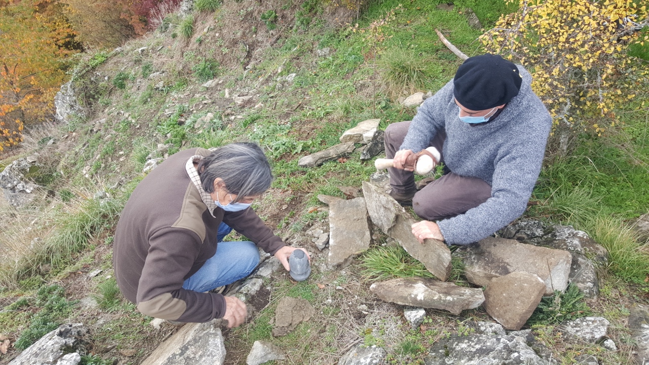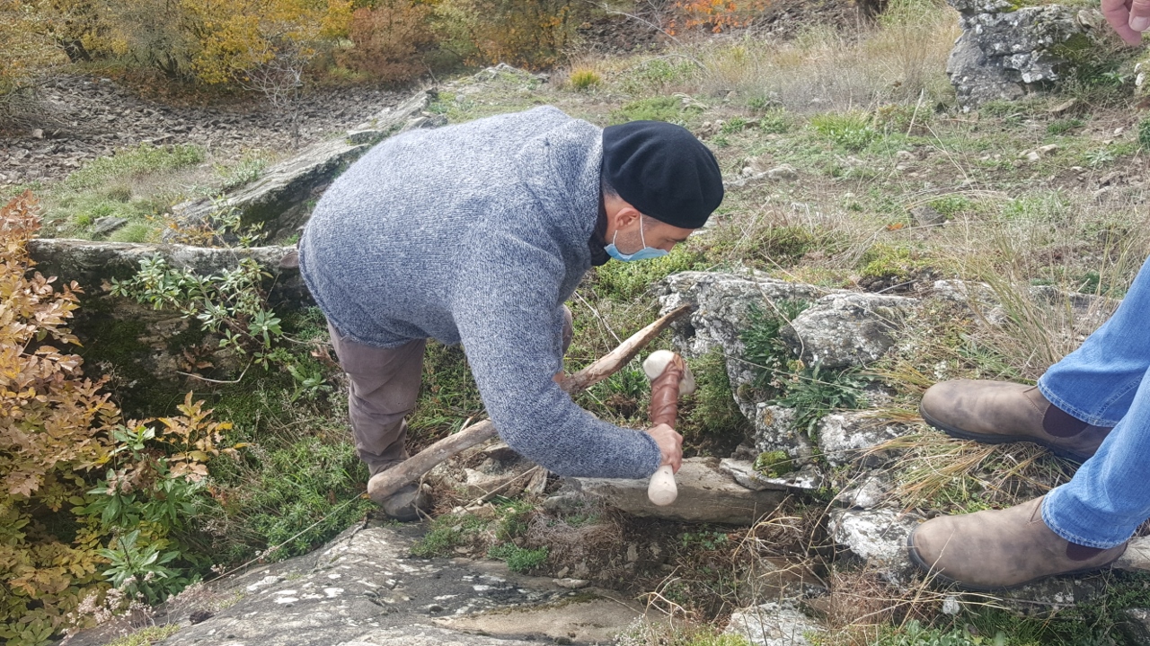 Una sfida piuttosto intensa è invece quella che sta affrontando lo scultore Dario Tazzioli, per la realizzazione delle cassette litiche utilizzando esclusivamente strumenti disponibili nell’Età del Bronzo. Tazzioli, residente a Frassinoro dove ha lo studio, è conosciuto a livello internazionale per la sua scelta di realizzare sculture che si rifanno alla tradizione rinascimentale utilizzando gli strumenti di quel periodo, ma qui ovviamente il contesto sarà completamente diverso: “Sicuramente utilizzare strumenti che non sono di ferro come utilizzavano i romani, nel medioevo e nel Rinascimento, ma solo strumenti litici e in bronzo, è completamente diverso. Ho realizzato gli strumenti basandomi sulle ricostruzioni degli archeologi, ad esempio un mazzuolo con manico in legno e testa di selce molto dura, fissata al manico con cordame di pelle, e un altro di diorite, senza manico. Sempre tramite gli archeologi cerco di ricostruire le modalità di lavoro per realizzare le lastre di pietra sbozzata necessarie per assemblare le sepolture. Per l’estrazione delle pietre da lavorare, qui vicino all’area di Campo Pianelli, utilizzo delle semplici leve lignee. Ci vuole un impegno consistente, anche a livello fisico, ma questo modo di lavorare mi permette di affrontare le stesse difficoltà e capire come operavano questi nostri avi”.
