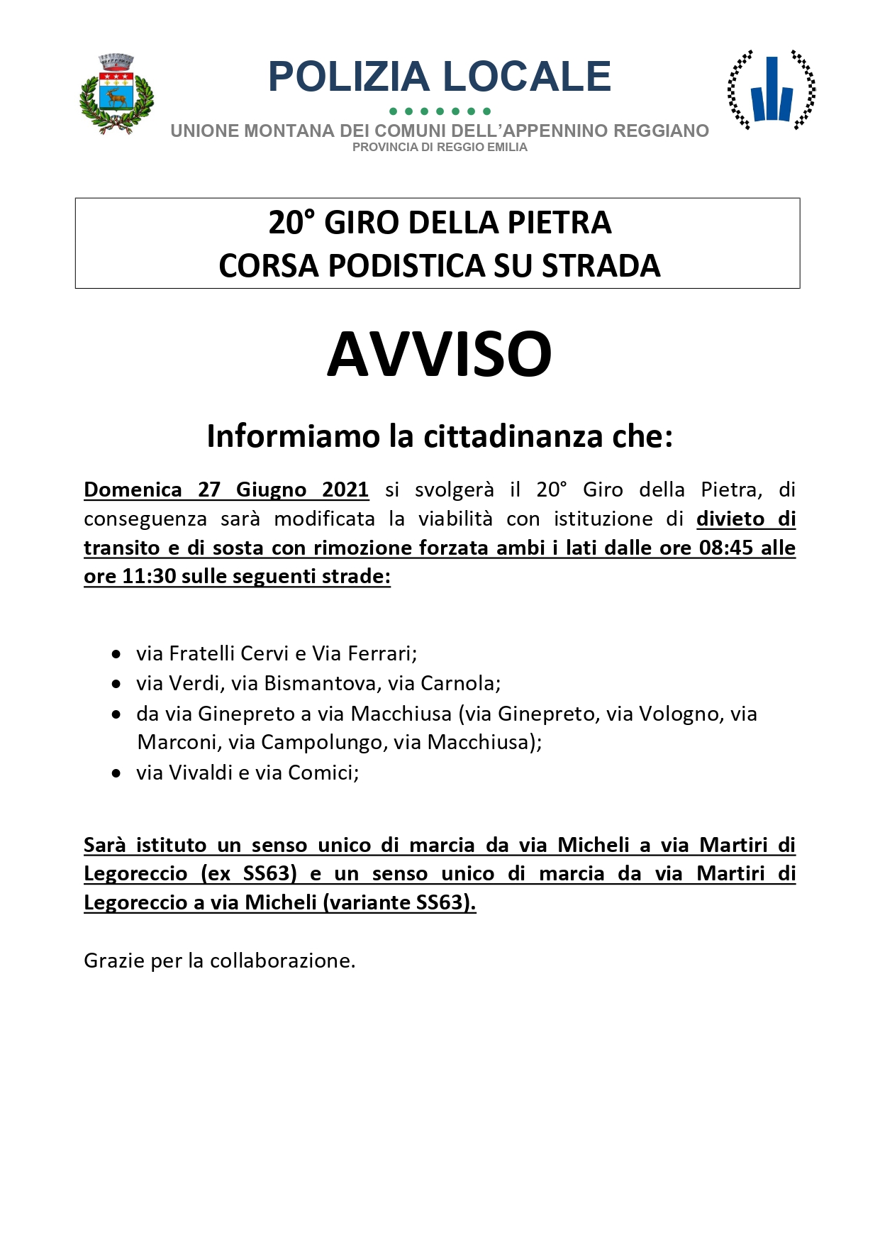 AVVISO – Limitazioni al traffico veicolare per la corsa podistica Il giro della Pietra domenica 27 giugno