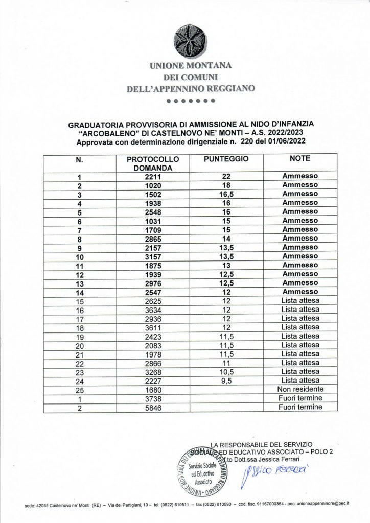 Si rende nota la graduatoria provvisoria di ammissione al nido d’infanzia “Arcobaleno” di Castelnovo ne’ Monti  per l’a.s. 2022/2023 approvata con determinazione dirigenziale n. 220 in data 01/06/2022.