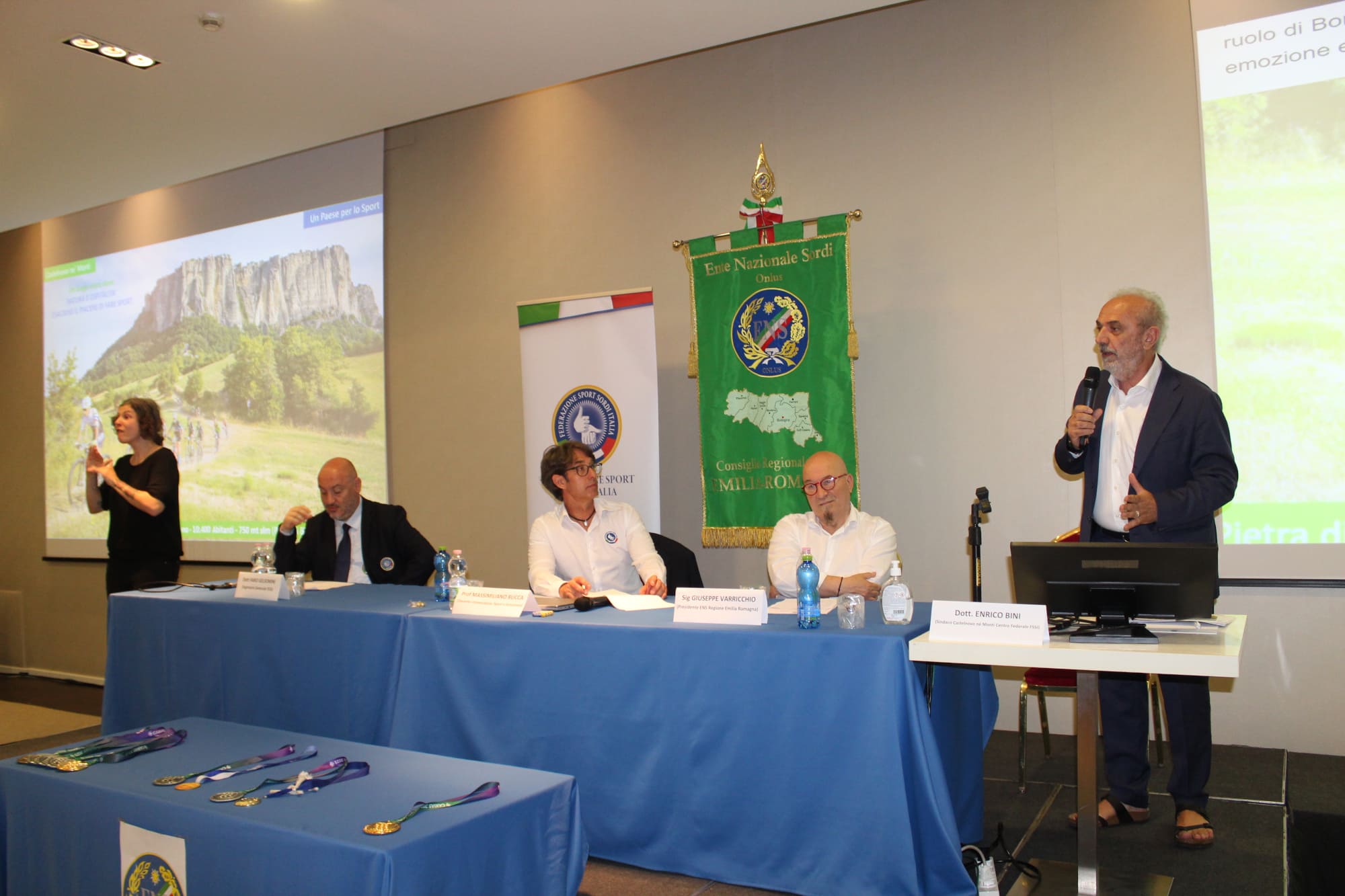 Il Sindaco di Castelnovo Monti Enrico Bini è intervenuto oggi a Bologna al convegno “Lo sport per gli Atleti Sordi: ieri, oggi e domani”. L’evento è stato promosso dal Consiglio Regionale dell’Emilia-Romagna dell’Ente Nazionale Sordi, a poche settimane dalla conclusione delle Olimpiadi dei sordi (Deaflympics) che si sono svolte in Brasile e che hanno complessivamente assegnato 23 medaglie all’Italia. In sala, davanti al tavolo dei relatori, luccicavano molte delle medaglie d’oro, argento e bronzo conquistate dagli atleti azzurri sordi, diversi dei quali unitamente al Segretario Generale della Federazione Sport Sordi Italia Fabio Gelsomini, sono intervenuti ed hanno ringraziato Castelnovo ne’ Monti quale luogo di preparazione e portafortuna per l’avventura olimpica. I lavori del convegno sono stati aperti dal presidente della Regione Emilia-Romagna Stefano Bonaccini che ha sottolineato l’attenzione e lo sforzo che la Regione pone da anni verso lo sport, inteso come “veicolo di benessere, corretto stile di vita, spettacolo, turismo ed anche inclusione”. In tale contesto si inserisce in modo prioritario anche il Centro Federale FSSI di Castelnovo citato da Bonaccini come “fiore all’occhiello delle scelte poste in essere dalla Regione nel 2022”. È poi entrato nel merito il sindaco Enrico Bini durante il suo intervento citando i valori intrinsechi del progetto. Dalla valorizzazione dell’impiantistica sportiva del paese, alle centinaia di presenze turistiche fuori stagione indotte dai tanti raduni in Appennino Reggiano, dal coinvolgimento delle associazioni sportive del territorio ad una importante azione di marketing territoriale fatta attraverso i protagonisti diretti dello sport di vertice dei non udenti. Non certo ultima per importanza è stata evidenziata la competenza del personale del reparto di audiologia dell’Ospedale S.Anna di Castelnovo Monti dove numerosi atleti durante i raduni in paese sostengono le visite audiometriche per l’eleggibilità olimpica in applicazione di principi e format internazionali. Le immagini della Pietra di Bismantova, delle visite delle squadre nelle latterie sociali del Parmigiano Reggiano e degli allenamenti negli impianti di Castelnovo hanno fatto da contorno all’intervento del Sindaco, verso il quale i dirigenti federali hanno mostrato tanta soddisfazione per quanto posto in essere e chiesto conferma di continuità progettuale in previsione del percorso di avvicinamento alle prossime Olimpiadi dei sordi, previste nel 2025 a Tokio.