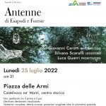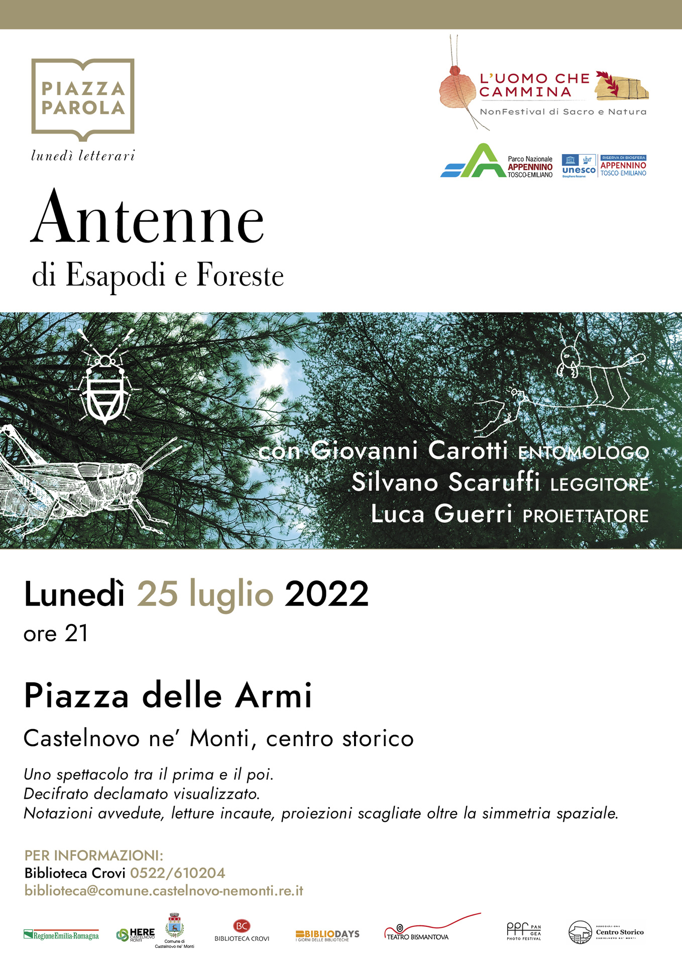Lunedì 25 luglio in Piazza delle Armi, sempre alle 21, sarà la volta dello spettacolo multimediale “Antenne: di Esapodi e Foreste”, con l’entomologo Giovanni Carotti, le letture di Silvano Scaruffi e le immagini proiettate di Luca Guerri, organizzato dal Parco Nazionale dell’Appennino Tosco-Emiliano. Un excursus avveniristico e “incauto” nel mondo degli insetti. Nel ventunesimo secolo nessuno crederebbe che quanto accade tra gli umani possa essere condizionato da intelligenze artropodi. Replicanti multizampe diretti da stimoli elettrici che corrono su assoni giganti, armati con esoscheletri indistruttibili, armi temporali. Nessuno ammetterebbe che le piante da centinaia di anni, hanno trovato la soluzione ai maggiori problemi che affliggono l’umanità.