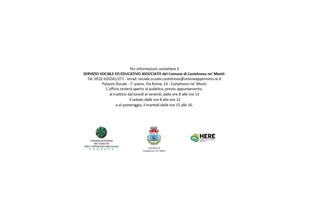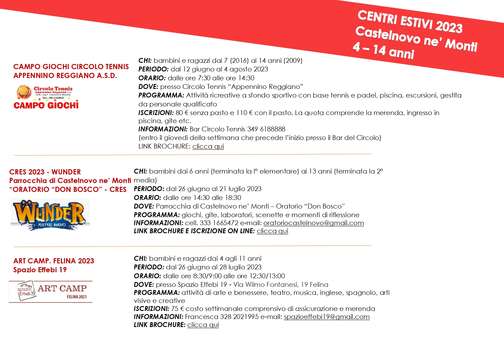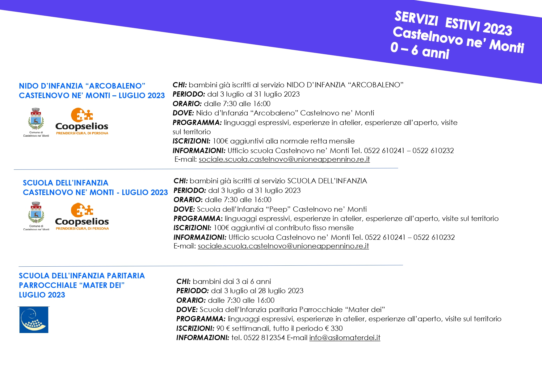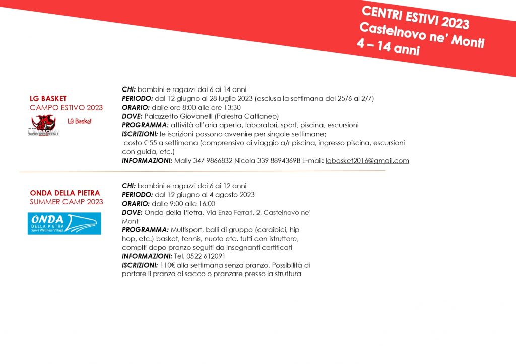 C’è un’ampia possibilità di scelta nell’ambito dei servizi estivi per i bambini e i ragazzi dagli 0 ai 14 anni. Campi e servizi di vario tipo sono organizzati da scuole, parrocchia, associazioni e coprono tutte le esigenze delle famiglie che nel periodo delle vacanze si trovano a dover riorganizzare le giornate, offrendo a ragazze e ragazzi opportunità di formazione e divertimento. Nella brochure tutte le indicazioni e i riferimenti per informazioni e iscrizioni.