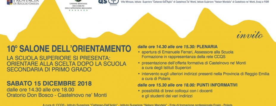 Sabato, 15 dicembre, all’Oratorio Don Bosco di Castelnovo Monti va in scena la 10^ edizione del Salone dell’Orientamento, un evento ormai fisso in cui ogni anno le scuole superiori si presentano per aiutare i ragazzi nella loro scelta dopo le scuole medie. Sabato dalle ore 14.30 alle 15.30 ci sarà la fase plenaria della giornata:…